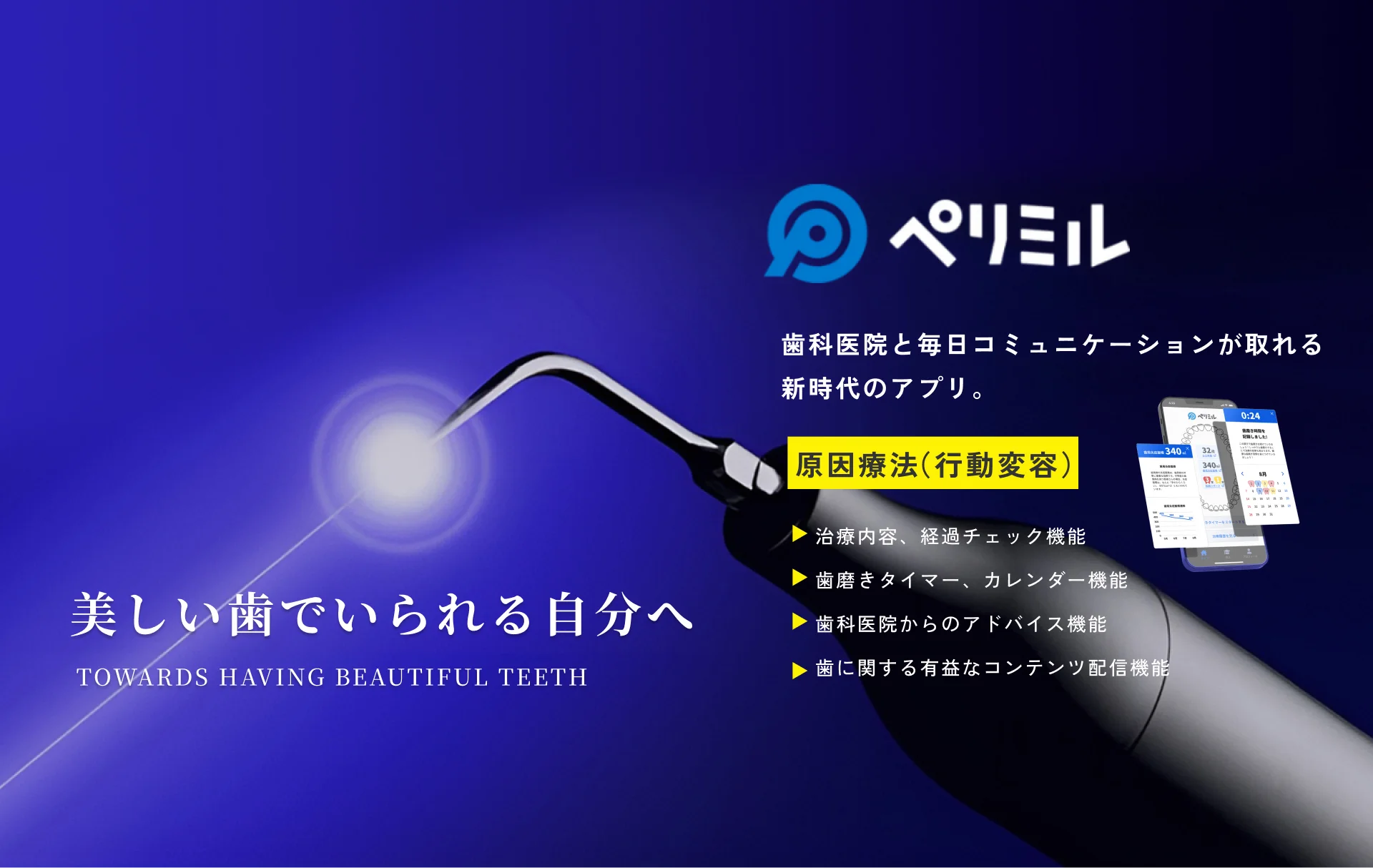 「ペリミル」は、患者さん自分自身がの口腔内に興味をもつことを習慣化させ、生活習慣病である歯周病の原因を絶つことを目的としたアプリです。 「ペリミル」を「ブルーラジカル P-01 」と連携させることで、スマートフォンで自身の治療時間や経過をチェックでき、1歯ごとのリスクや全体の炎症状態などをイラストで確認することができます。 また、随時送られる歯科衛生士からのコメントで歯磨き指導を受けたり、歯磨きタイマーでブラッシング習慣化のサポートを受けることもできます。