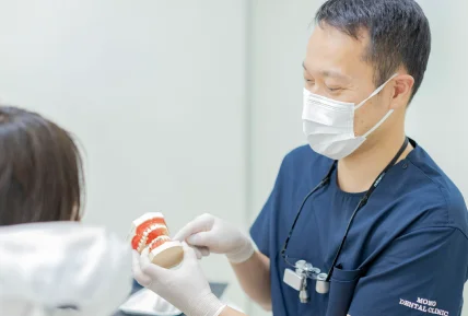 MOMO DENTAL CLINICではしっかりとした診断をし、出来るだけ分かりやすく現状と治療法の説明をし、納得して頂いてから治療をすすめていきますので、安心して治療を受けられます。 そのために当院では、診断と説明のための設備、しっかりとした治療をするための設備と技術、またリラックスできる環境を提供できるよう心がけております。 現在、歯科治療の詰め物、被せ物は昔ながらの金属製のものもあれば、目立たないセラミックなどの白いものもあります。 お口の中は歯などの失った機能の回復はもちろんですが、見た目の回復もとても大切です。患者様一人一人のライフスタイルに合った治療を一緒に考えていければと思っております。 歯科治療は私たちの一方通行な治療では健康な歯を保ち続けることはできません。 私たちと一緒に二人三脚でいつまでも健康で美しい歯を手に入れてみませんか?