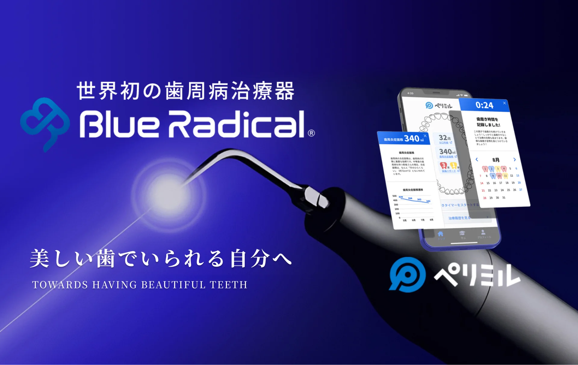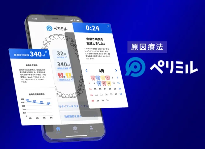 「ペリミル」は、患者さん自分自身がの口腔内に興味をもつことを習慣化させ、生活習慣病である歯周病の原因を絶つことを目的としたアプリです。 「ペリミル」を「ブルーラジカル P-01 」と連携させることで、スマートフォンで自身の治療時間や経過をチェックでき、1歯ごとのリスクや全体の炎症状態などをイラストで確認することができます。 また、随時送られる歯科衛生士からのコメントで歯磨き指導を受けたり、歯磨きタイマーでブラッシング習慣化のサポートを受けることもできます。