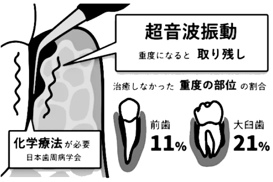 超音波振動のみの治療となるため、重度になると、歯石の取り残しが増え、治療が難しくなります。副作用を伴う抗菌薬といった科学療法が必要になります。